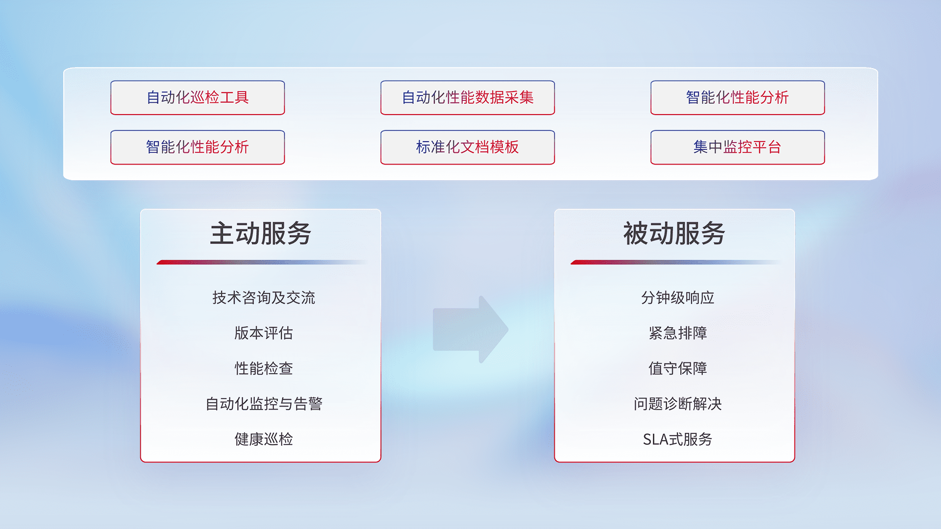 智能化工具和标准化文档,,保障服务质量,,,,提供主动服务(包含技术咨询、、版本评估、、、、性能检查、、、、自动化监控与告警、、、、健康巡检)和被动服务包含(分钟级响应、、紧急排障、、值守保障、、、问题诊断解决、、、SLA服务)。。